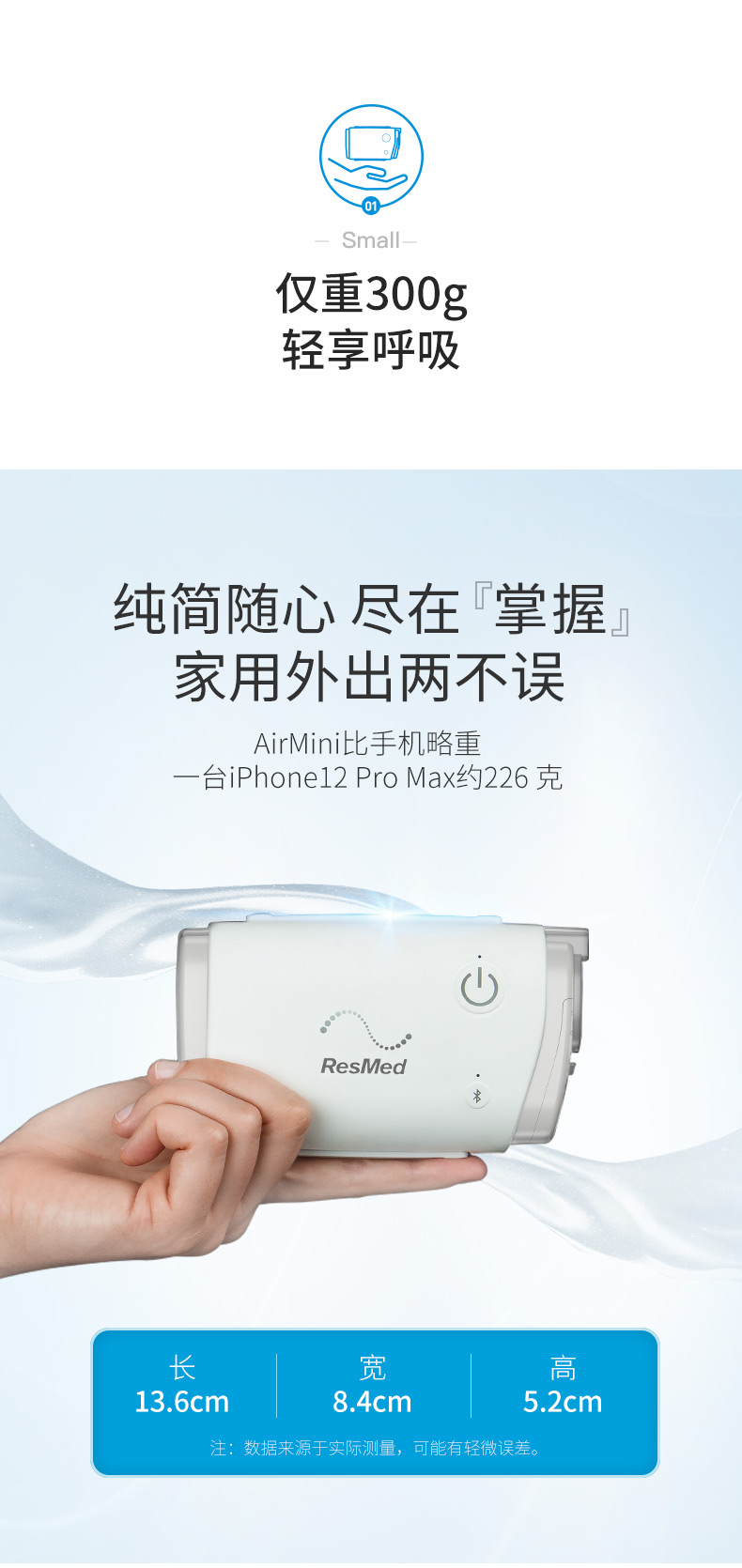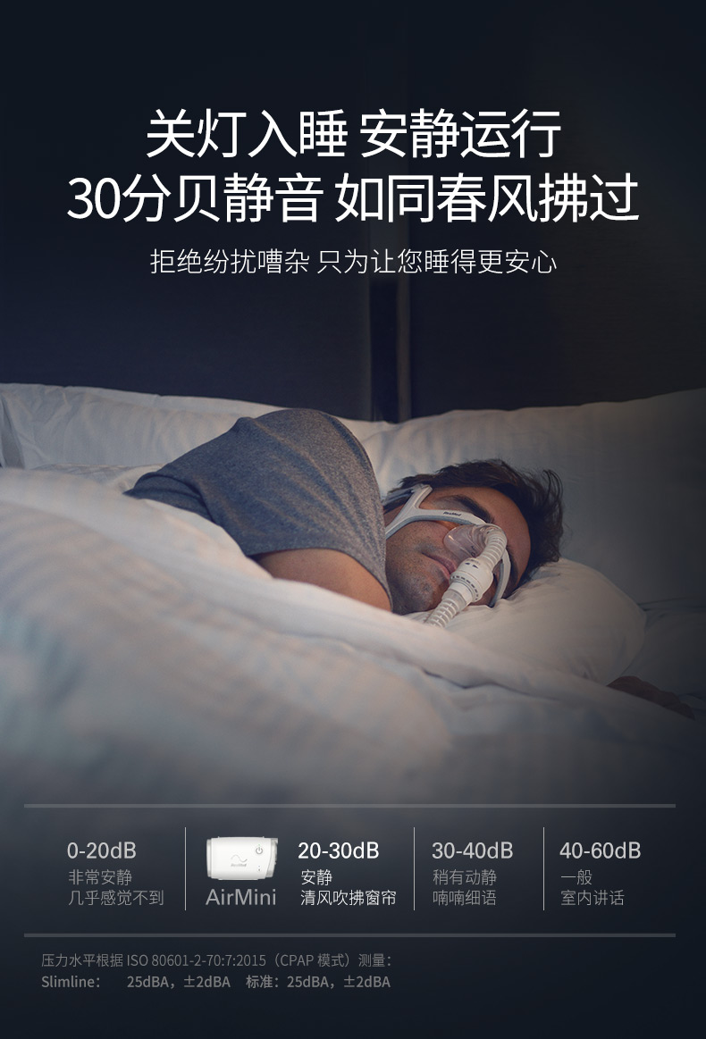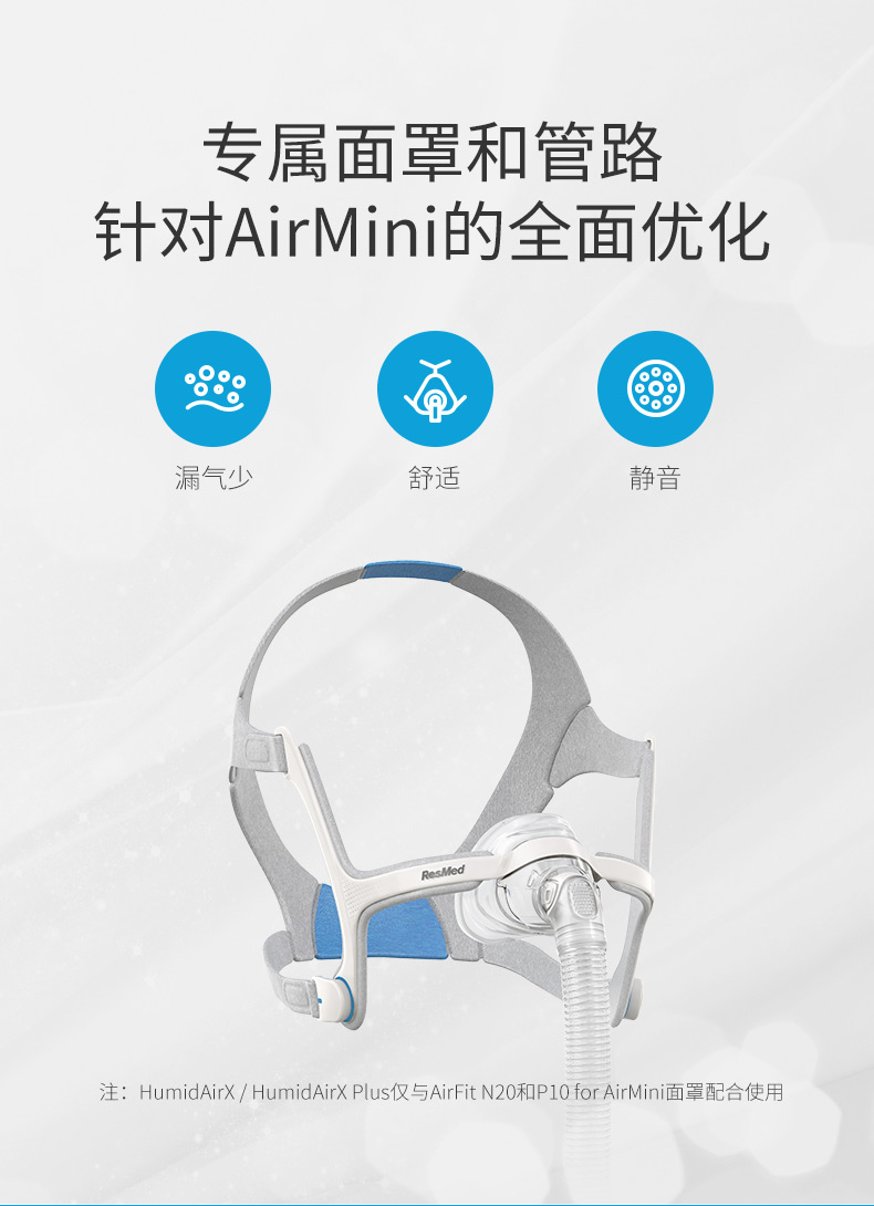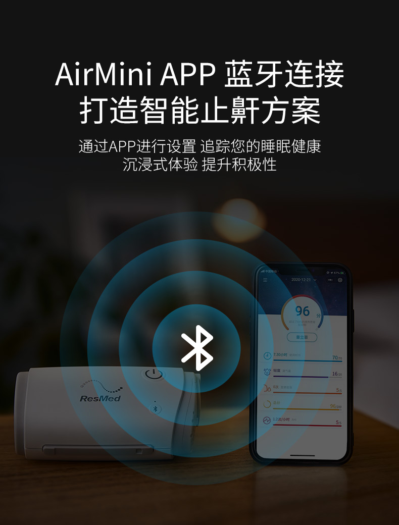 AirMini正壓通氣治療機(jī) l 便攜小巧自由隨行 融匯小巧與輕盈,時尚簡約 便攜自由 隨時隨地輕松治療 l 智享藍(lán)牙智慧舒適 藍(lán)牙連接,APP調(diào)節(jié)參數(shù) 數(shù)據(jù)信息,盡在掌握 無水加濕,舒適睡眠新體驗 l 科技呵護(hù)專業(yè)可靠 三扇葉馬達(dá) Active Airt恒量排氣技術(shù) 算法可靠,個性化治療新選擇